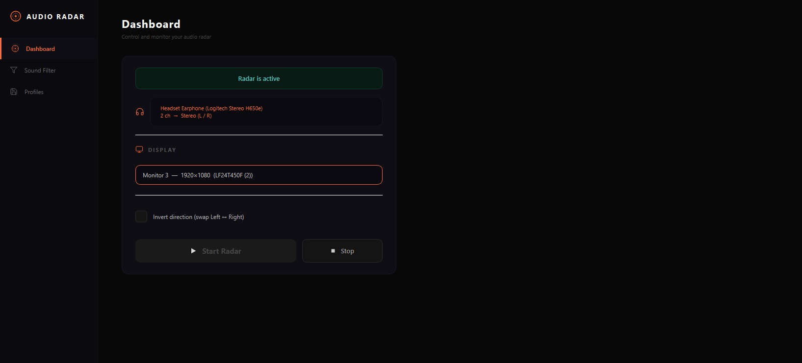 - For Stereo Headsets: If your game outputs pure stereo or you use software like SteelSeries Sonar, the radar will automatically fall back to Stereo L/R Mode. You will accurately see how far Left or Right a sound is, but the radar will not be able to distinguish between Front and Back.